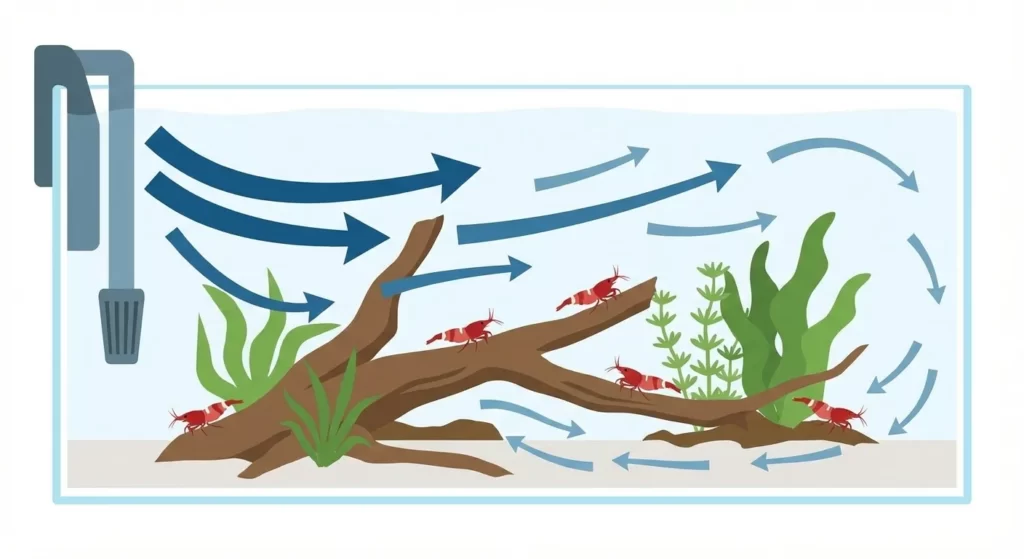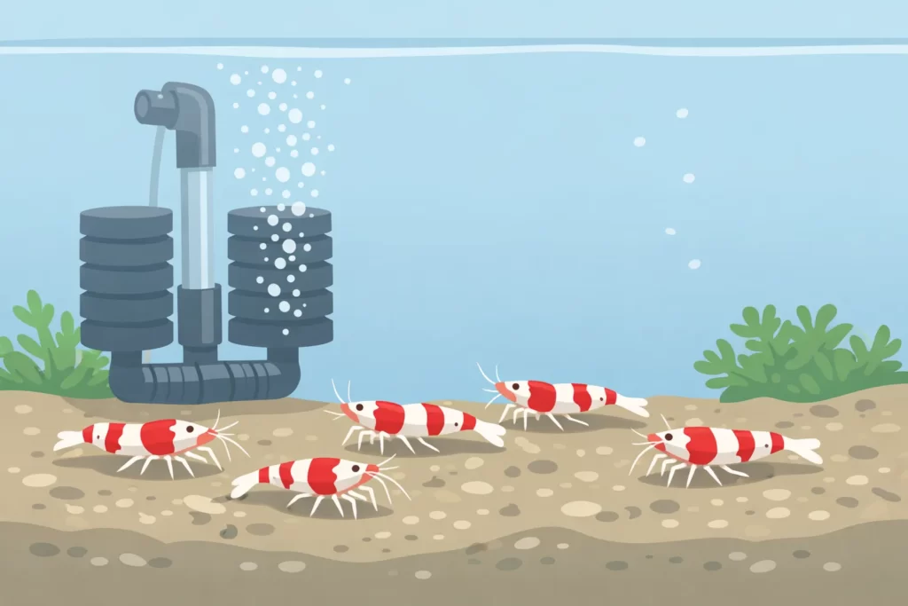 強い水流は、エビにとって常に踏ん張るストレスになりやすいし、稚エビは流されやすいです。