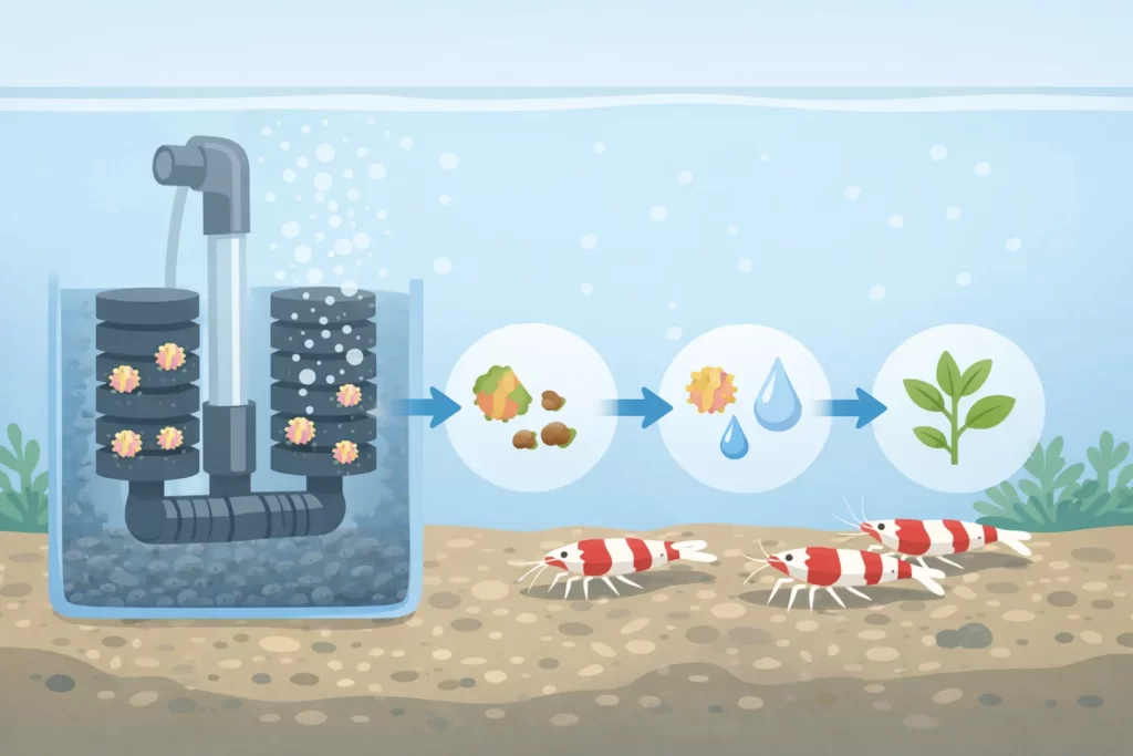 最後にまとめです。レッドビーシュリンプの濾過器は、ろ過能力の強さより安定性と穏やかさを優先したほうが、結果として成功率が上がります。私のおすすめの順番は、まずスポンジフィルターを基礎にして、必要なら底面フィルターと併用。外部フィルターや外掛けフィルターは、吸い込み防止と水流調整ができる人なら条件付きでOK、という立ち位置です。