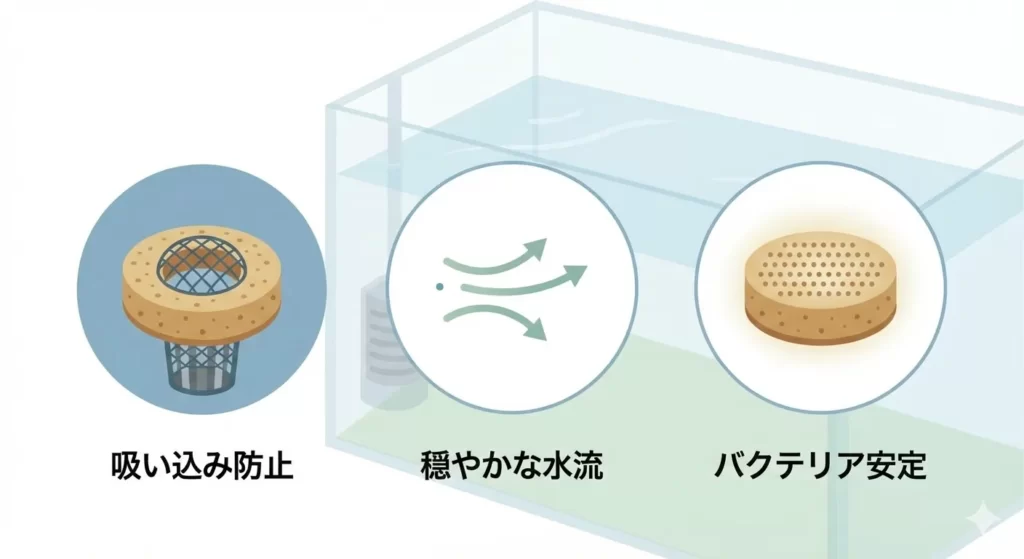 - 稚エビの吸い込み防止と水流の調整