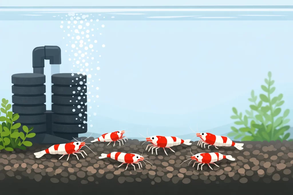 魚なら耐える条件でも、エビはあっさり落ちることがあります。