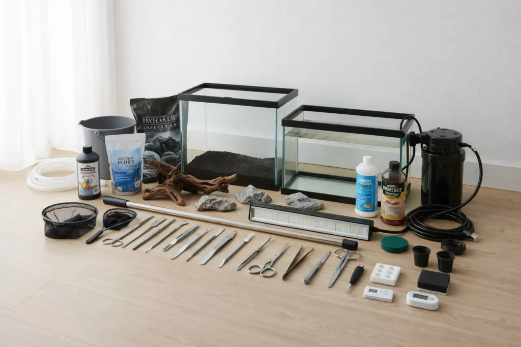 やりたいジャンル(魚・水草・レッドビー・アピスト)を決めたら、立ち上げで水を育てて、導入はゆっくり、維持は“急変させない”。