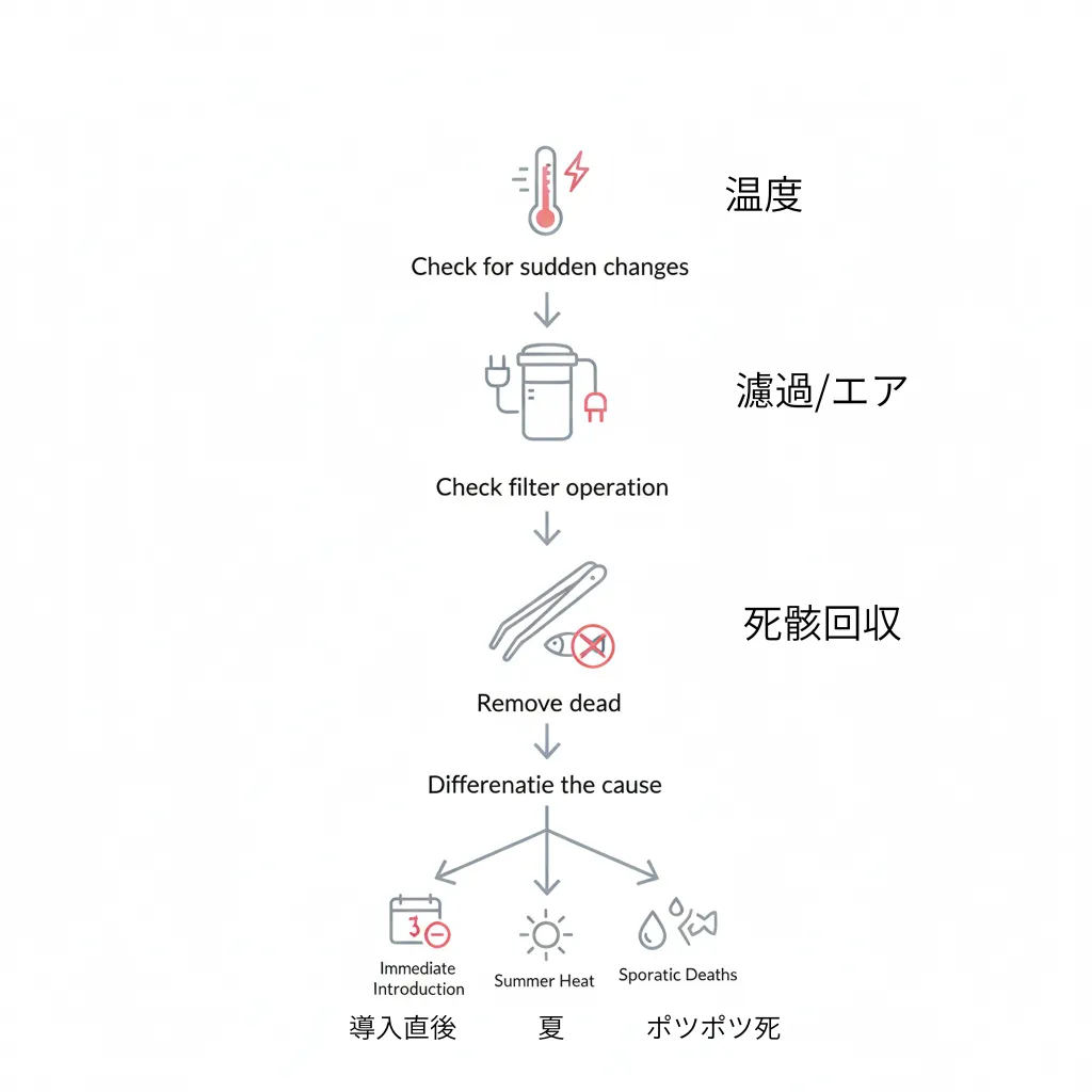 - ポツポツ死が続く → アンモニア/亜硝酸チェック
