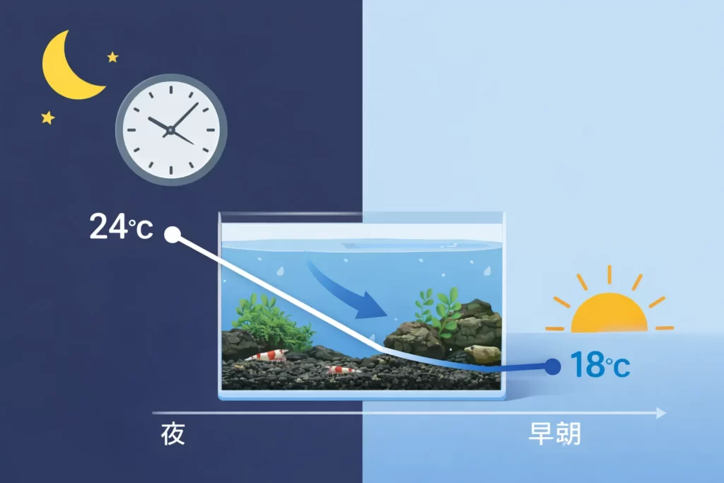 人が寝てる時間、あるいは外出してる時間に、室温がスッと落ちて水温もつられて落ちます。