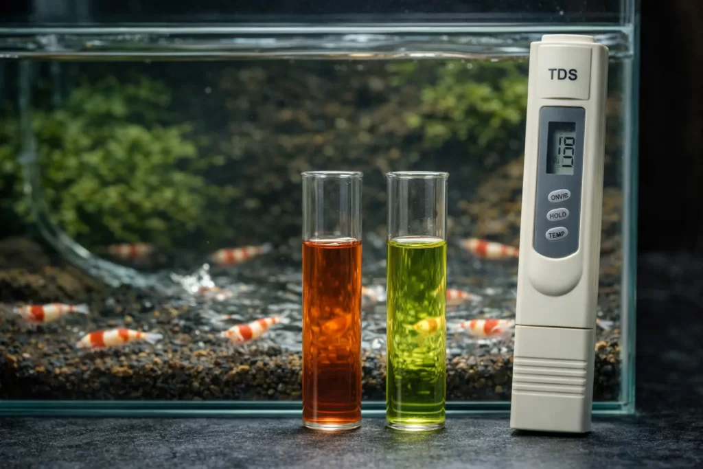 レッドビーシュリンプは、一般的に弱酸性〜中性寄りの範囲で安定している方が飼いやすいです。